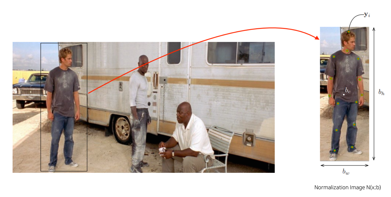 이때 y_i의 좌표는 아래식과 같이 normalize한 N(y_i, b)로 사용되며, 이때 b는 사람의 신체에 대한 바운딩박스를 의미한다.