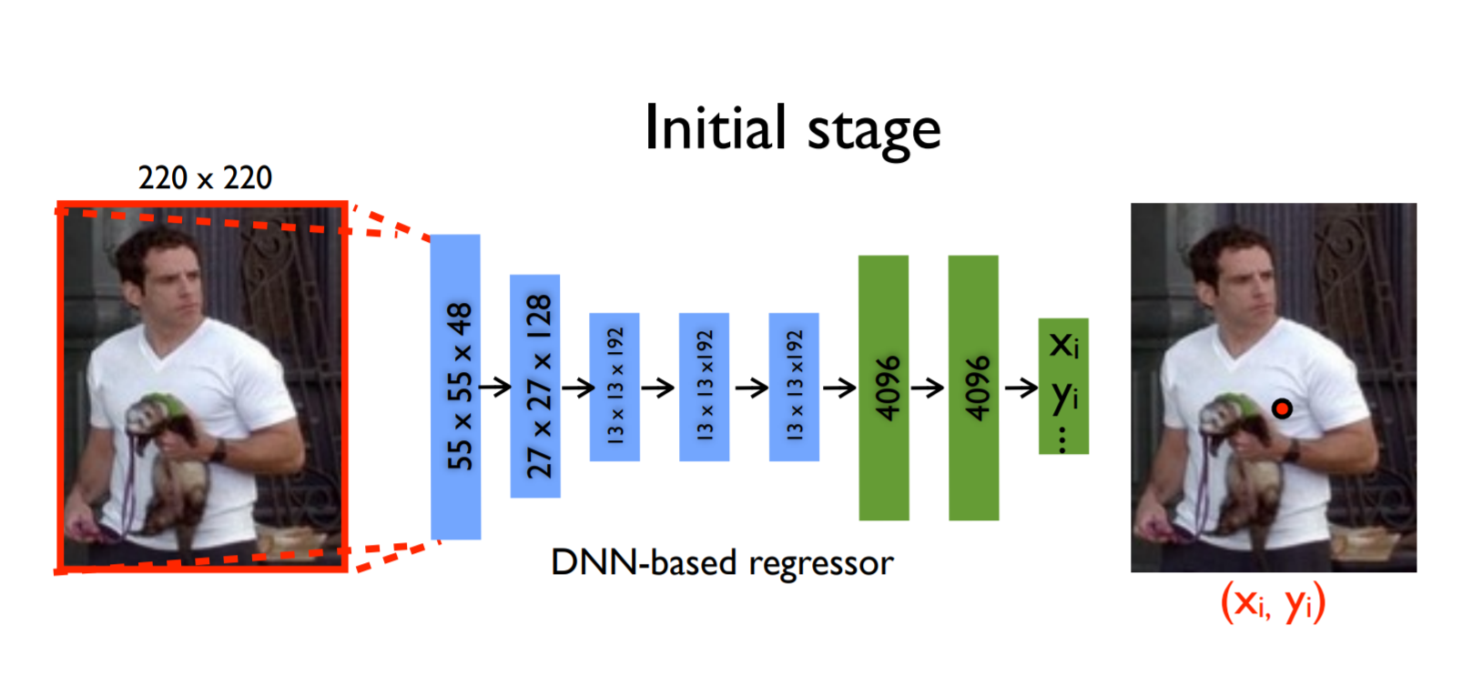 입력 이미지와 파라미터를 가지고 CNN이 정규화된 예측 값을 내놓고, 이를 다시 정규화를 역으로 적용하여 관절 예측 벡터인 y*를 내놓게 된다. 이것이 위 그림에서 initialState에 해당한다. 이렇게 구한 관절 예측 값은 큰 이미지를 보고 예측한 것이라 정교함이 떨어진다는 것이 저자의 주장이다. 여기서 제안된 아이디어는 예측 좌표 주변으로 바운딩 박스를 다시 그리고, 이를 Crop하여 다시 CNN 모델을 통과시키는 Cascade 방식이다.