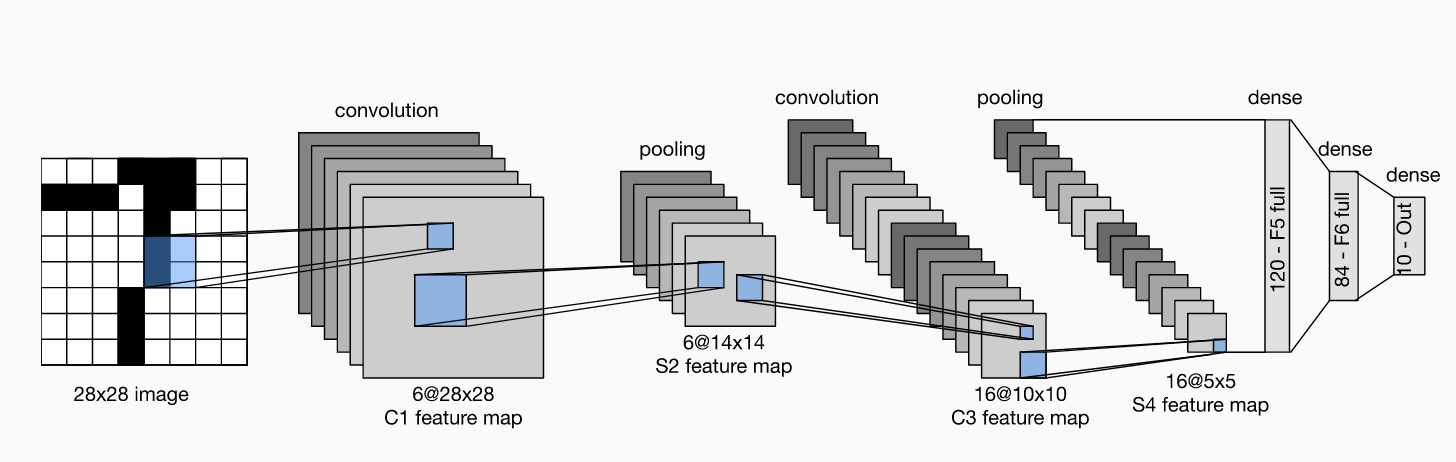 아래 그림이 “Gradient-based learning applied to document recognition”에서 제안했던 LeNet-5의 Architecture이다. LeNet-5는 Convolution layer(C1,C3,C5) 3개, Subsampling layer(S2, S4) 2개, Fully connected layer(F6) 1개로 구성되어있다.C1~F6 Layers 활성화 함수는 tanh이다.