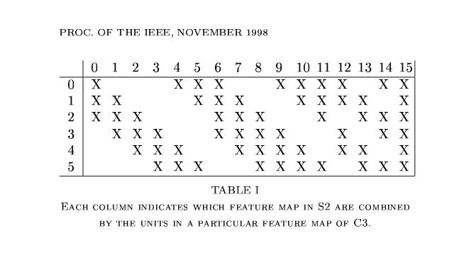 여기서 다시 5x5 Filter로 Convolution하여 10x10 Feature map 16개를 만들고(즉, 6장의 14x14 Feature map으로터 16장의 10x10 Feature map을 산출해낸다.), 이를 2x2 Subsampling (Average pooing 사용)하여 5x5 Feature map 16개를 만든다. 참고로 여기서 각 Filter의 값들은 지정하는 것이 아니라 학습을 통해 결정된다. 6개의 모든 Feature map이 16개의 Filter처리 하는 것이 아니라 아래 Table과 같이 선택적으로 입력 영상을 선택하여 반영했다. 이 과정에서 6개의 feature map을 처음 6개는 연속되게 이웃하는 3개의 featuremap들의 조합에서 구하고, 그 다음 6개는 연속되게 이웃하는 4개 feature maps의 조합, 그 다음 3개는 sparse하게 남는 4개의 조합, 그리고 마지막 16번째는 6개를 모두 반영한 feature를 뽑을 수 있도로 구성했다. 그 이유는 연산량의 크기를 줄이고, 연결의 symmetry(대칭)를 깨줌으로써 처음 convolution으로부터 얻은 6개의 low-level feature가 서로 다른 조합으로 섞이며 global feature로 나타나기를 기대하기 때문이다. 아래 Table에서 보면 1열의 값들 0~5는 S2 Layer에서의 피쳐맵들이고, 1행의 0~15는 16장의 필터를 뜻한다.