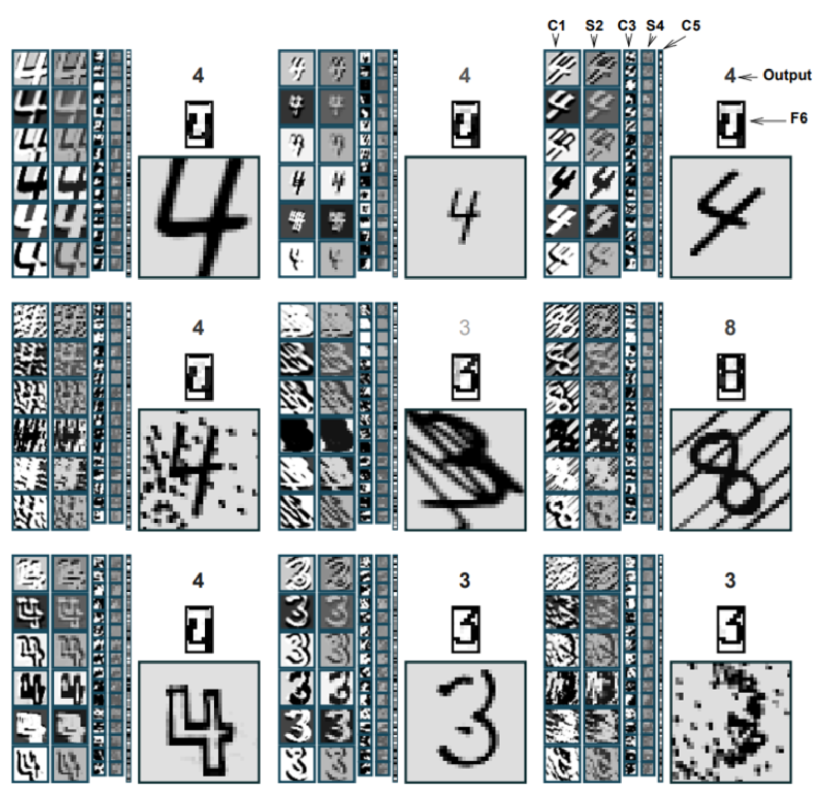 아래 그림은 LeNet-5에서 C1, S2, C3, S4, C5, F6에서 이미지가 변환된 결과를 보여주는 그림이다. 여기서 C1과 C3는 Convolution 결과이고, S2와 S4는 Subsampling 결과이다. C1/S2, C3/S4, C5 단계를 거치면서 Topology 변화에 강한 Feature를 생성한 후, F6의 Fully connected layer를 지나 Output layer로 전달되어 최종적으로 숫자를 인식하게 된다. 이러한 Convolution과 Subsampling 과정으로 Topological 변화에 강한 Global feature를 얻었기 때문에 Noise가 상당한 경우에도 잘 구분하는 것을 볼 수 있다.