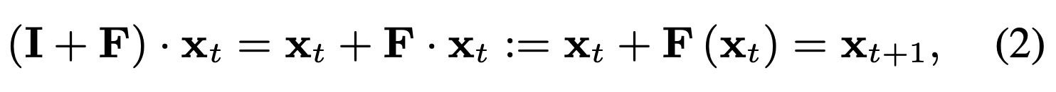 여기서 F * xt는 xt에 대해 residual function F를 수행한 결과를 나타낸다.