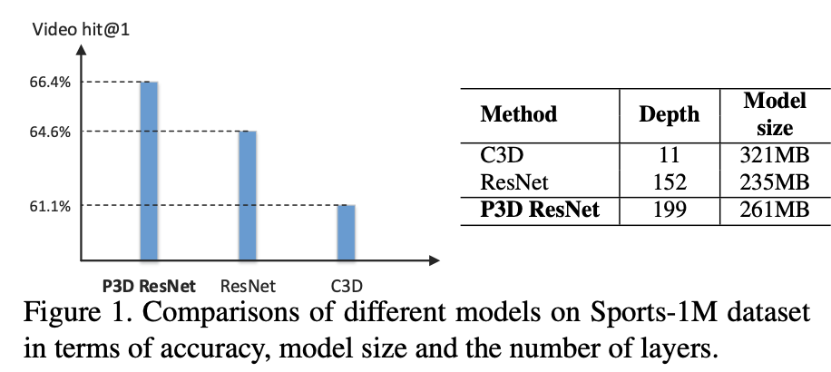 3D CNN에서 널리 사용되는 11 계층의 네트워크가 152 계층 ResNet보다 훨씬 큰 321MB에 이른다. 때문에 매우 깊은 3D CNN을 훈련하기가 매우 어렵다. 더 중요한 것은 Sports-1M Data set에서 ResNet-152를 미세 조정하면 아래 이미지와 같이 3D CNN보다 더 좋은 정확도를 얻을 수 있는 것을 확인할 수 있다.