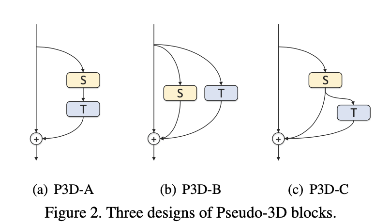 (a) P3D-A : 첫 번째 설계에서는 시간적 1D 필터(T)가 공간적 2D 필터(S)를 cas-caded 식으로 따르도록 하여 stacked Architecture구조를 고려한다. 따라서 두 종류의 필터는 동일한 경로에서 서로 직접적인 영향을 미칠 수 있으며 시간적 1D 필터만 최종 출력에 직접 연결된다.