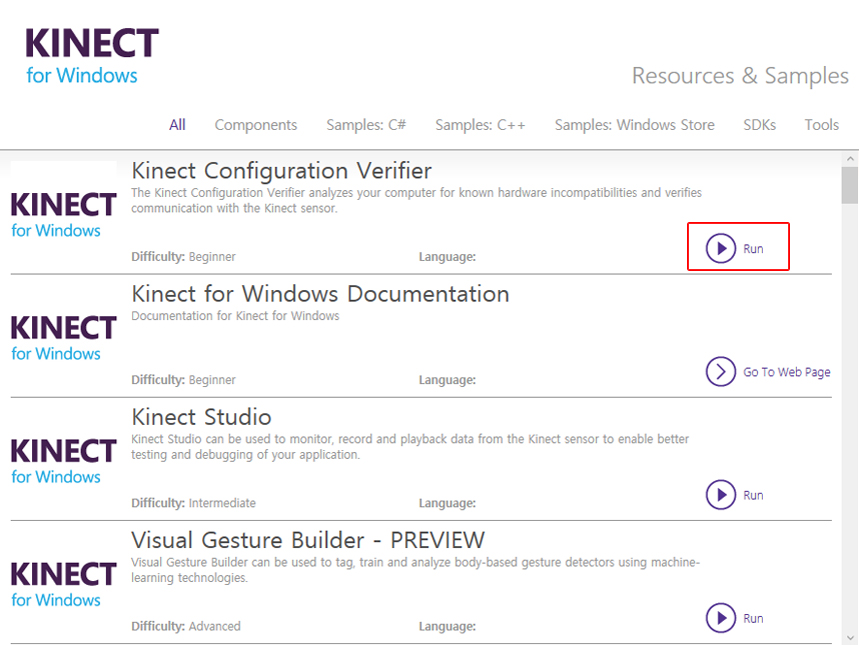 실행된 SDK Browser에서 Kinect Configuration Verifier의 Run을 클릭하여 실행해줍니다.