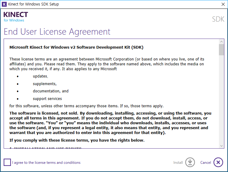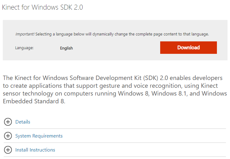 Kinect v2을 실행하기 위해서는 Kinect v2 SDK를 먼저 다운로드하여야 합니다.
