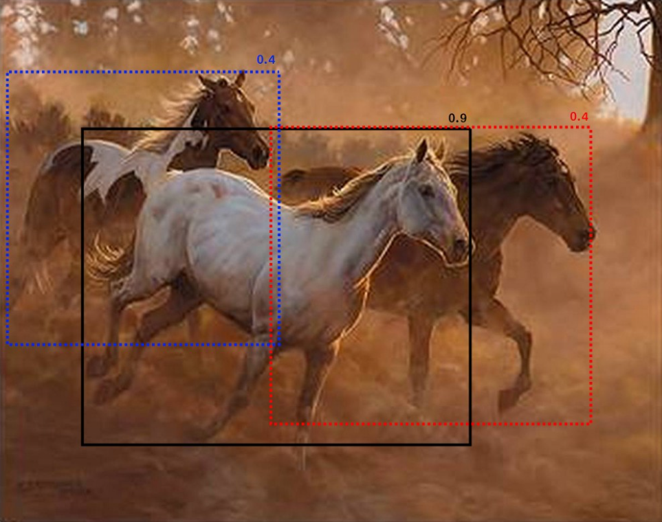 위의 알고리즘은 가장 높은 confidence를 가지는 bbox를 찾고, bbox들 중 겹치는 영역이 임계값 이상이며 제거해서 중복을 제거한다. 그러나 이 임계값을 설정하는 것은 매우 까다로우며 mAP가 낮아지는 문제가 있다. 예시로 아래 그림과 같은 상황이 있다. 아래 그림은 말들이 겹쳐져 있다. 이 때 confidence는 0.8 / 0.9 / 0.8 이다. 가장 높은 0.9의 말을 제외하고 0.8의 말은 사라진다.