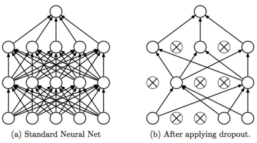 과적합(over-fiting)을 막기 위해서 dropout을 사용했다. dropout이란 뉴런 중 일부를 생략하면서 학습을 진행하는 것을 말한다. 매 입력마다 dropout을 적용시키면 가중치는 공유되지만 신경망은 서로 다른 구조를 띄게 된다. 때문에 뉴런은 특정 다른 뉴런의 존재에 의존하지 않기 때문에 co-adaptation을 감소시킨다고 한다. 그러므로 서로 다른 뉴런의 임의의 부분집합끼리 결합에 유용한 robust 특징을 배울 수 있다. dropout은 훈련시에 적용되는 것이고 테스트시에는 모든 뉴런을 사용한다.