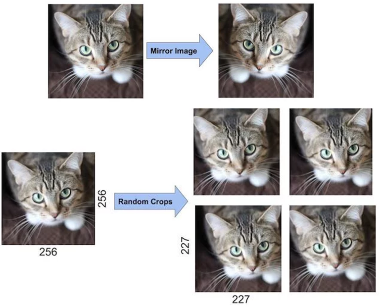 논문에서는 2가지의 Data augmentation을 적용했다. Data augmentation은 현재 가지고 있는 데이터를 변형하여 다양한 데이터를 좀 더 얻는 것으로 CNN모델을 학습시키기 위해 만들어진 개념이다. Data augmentation은 적은 노력으로 다양한 데이터를 형성하게 하여 over-fiting을 피하게 해준다. Alex net에서 사용된 첫 번째 기법은 generating image translation and horizontal reflection이다. 이 기법은 256 x 256 이미지를 수평 반전하고 224 x 224 크기로 Random 하게 crop 한다. 그리고 생성된 이미지를 horiontal reflection한다. 그러면 하나의 이미지에서 10개의 이미지를 생성할 수 있다. 모델이 10개의 패치에 대해 예측한 값을 평균내어 최종 예측값으로 사용한다.