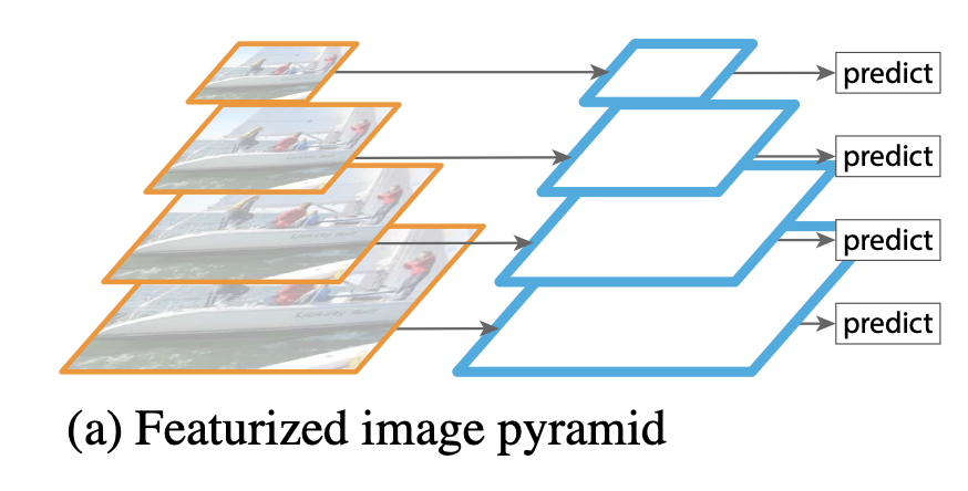 (a) Input Image의 크기를 다양하게 resize하고 이미지 네트워크에 입력하는 방법이다. 다양한 크기의 객체를 포착하는데 좋은 결과를 보여준다. 하지만 연산량이 많아 추론 속도가 매우 느리며, 메모리를 굉장히 많이 사용한다. 때문에 현실에서 사용하기 어렵다.