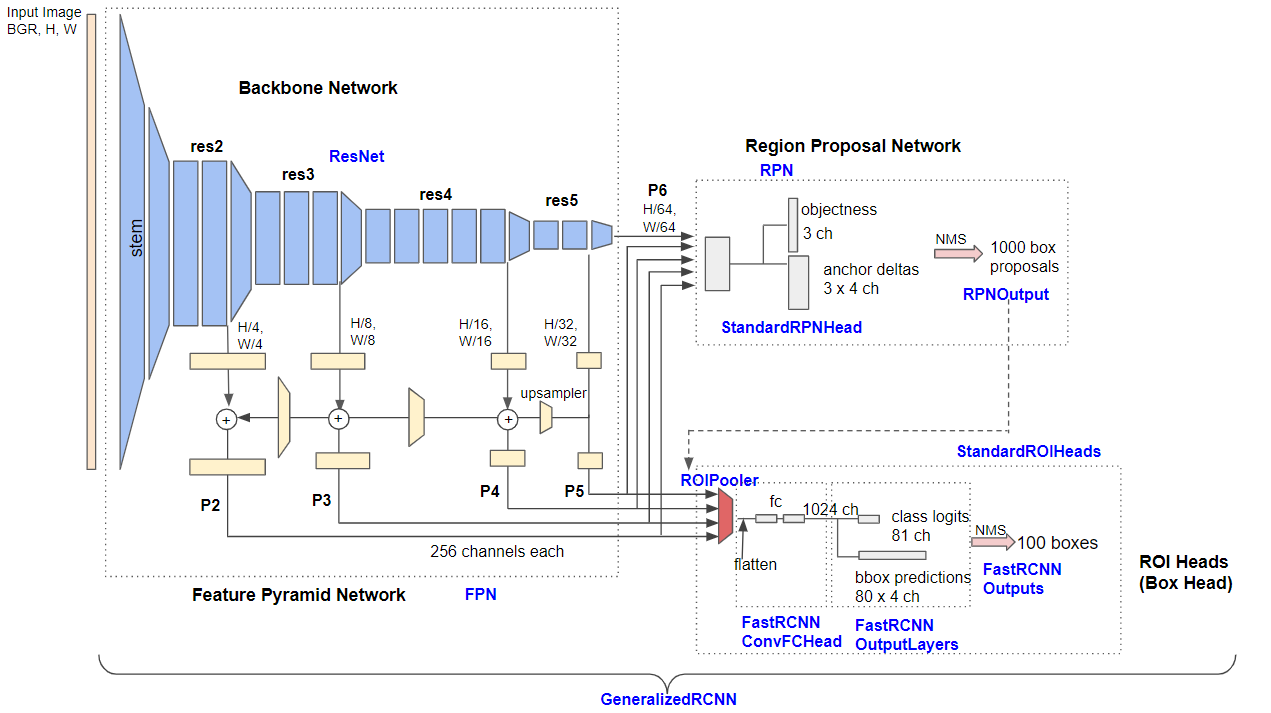 먼저 ResNet 기반의 FPN에 이미지를 입력한 후 Bottom-up pathway을 거쳐 원본 이미지의 1/4, 1/8, 1/16, 1/32 크기에 해당하는 feature map {c5,c4,c3,c2}을 출력한다. 이후 Top-down pathway과정을 통해 1x1 conv 연산을 적용하여 모든 feature map {c5,c4,c3,c2}를 출력한다. 이후 Top-down path way과정을 통해 1x1 conv 연산을 적용하여 모든 featrue map의 channel 수를 256으로 맞춰주고 크기를 2배로 upsapmling 해준다. 마지막으로 Lateral connections을 통해 각 feature map을 바로 아래 pyramid level에 존재하는 feature map과 element-wise addtion 연산을 수행한다. 이후 3x3 conv 연산을 수행하여 {c5,c4,c3,c2} feature map을 출력한다. 앞의 과정을 통해 얻은 feature pyramid {c5,c4,c3,c2}는 RPN와 ROI pooling시 사용된다.