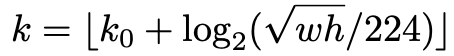 여기서 k는 피쳐 맵의 번호입니다. 224란 크기는 pretrained model이 224x224 크기의 이미지를 학습한 것에서 따왔습니다. k0는 224x224 크기의 ROI가 들어왔을 때 몇 번째 피쳐맵에 사상시킬 것인지를 결정하는 수이며, 논문에서는 4로 설정되었습니다. 만약 512x512 크기의 RoI가 입력으로 들어왔다면 4+log2(2.28) = 5.11로 P5에 사상됩니다. 이를 시각화하면 아래와 같습니다.