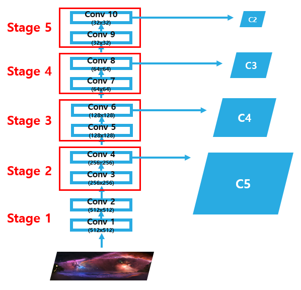 ResNet의 경우 각 stage의 마지막 residual block의 output feature map을 활용하여 feature pyramid를 구성하며 각 output을 {c5,c4,c3,c2}라고 지정한다. 이는 conv4, conv6, conv8, conv10의 output feature map임을 의미하며, 각각 {4,8,16,32} strid를 가지고 있다. 여기서 {c5,c4,c3,c2} 은 각가 원본 이미지의 1/4, 1/8, 1/16, 1/32 크기를 가진 feature map이다. conv2의 output feature map의 경우 너무 많은 메모리를 차지하여 제외했다.