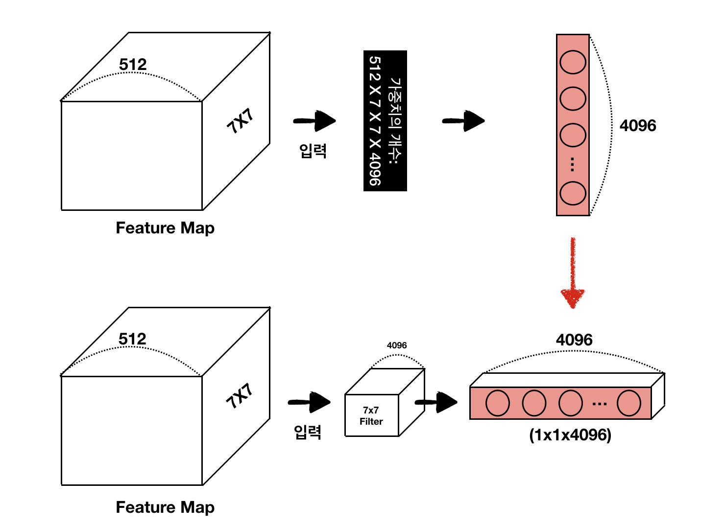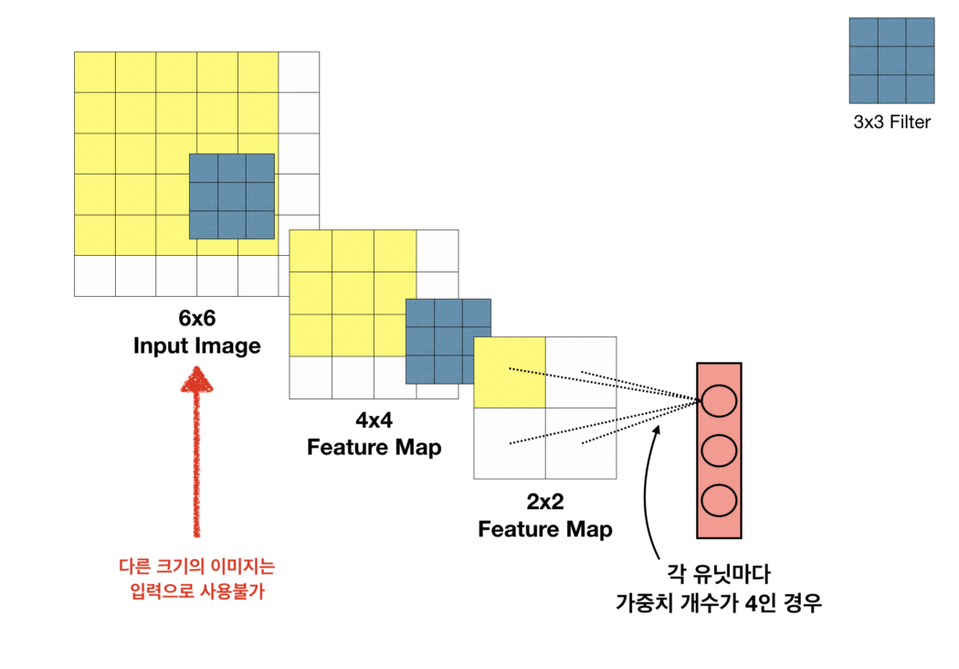 아래 그림(좌)를 보게 되면 fully-connected layer 연산 이후 Receptive field 개념이 사라진다. 그림(우)를 보게 되면 Dense layer에 가중치 개수가 고정되어 있기 때문에 바로 앞 레이어의 Feature Map의 크기도 고정되며, 연쇄적으로 각 레이어의 Feature Map 크기와 Input Image 크기 역시 고정된다.