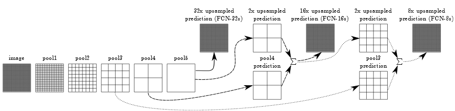 위 그림을 보면, 마지막 pool 5 layer에서 stride 32로 upsample을 해서 prediction map을 만들어낸다. 하지만, pooling layer를 거치면 거칠수록 원래의 정보보단 고차원적인 feature들의 정보가 있으므로 32배로 upsample 한 결과는 디테일하지 못하다. 그렇기에 이 논문에서 제안하는 것이 그 전의 layer의 정보도 같이 사용하자(skip combining)는 것이다. 그 전의 layer는 현재의 layer가 가지는 정보보다 디테일한 정보를 가지고 있기 때문에 복원하는 데에 있어서 좀 더 효율적이라는 이야기이다.