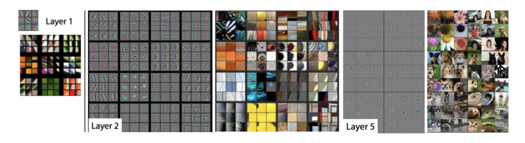 아래 그림을 보면 시각화 모델을 통해 입력 이미지에 대해 얕은 층에서는 주로 직선 및 곡선, 색상 등의 낮은 수준의 특징에 활성화되고, 깊은 층에서는 보다 복잡하고 포괄적인 개체 정보에 활성화된다는 것을 확인할 수 있다. 또한 얕은 층에선 local feature를 깊은 층에선 global feature를 감지한다고 볼 수 있다.