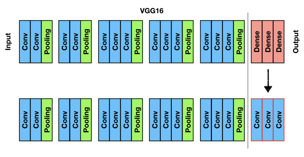 VGG-16은 feature의 뒤에 4096, 4096, 1000으로 이어지는 FCL을 연결하여 Classification을 한다. 하지만 본 논문에서는 아래 그림처럼 FCL을 모두 1x1형태의 Convolution으로 전환한다. 그 이유는 위에서 설명한 것 처럼 위치 정보가 손실되지 않고, 어떠한 입력 이미지의 크기도 허용될 수 있기 때문이다. 이 1x1 conv의 결과물이 class의 feautre map상에서의 classification(즉, segmentation)이 된다. 1x1 conv depth channel은 각 class를 의미하므로, 어떤 class의 segmentation heatmap도 추정할 수 있다.