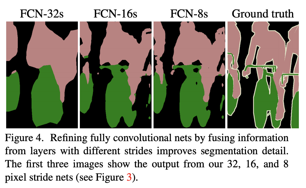위 그림을 보면, 마지막 pool 5 layer에서 stride 32로 upsample을 해서 prediction map을 만들어낸다. 하지만, pooling layer를 거치면 거칠수록 원래의 정보보단 고차원적인 feature들의 정보가 있으므로 32배로 upsample 한 결과는 디테일하지 못하다. 그렇기에 이 논문에서 제안하는 것이 그 전의 layer의 정보도 같이 사용하자(skip combining)는 것이다. 그 전의 layer는 현재의 layer가 가지는 정보보다 디테일한 정보를 가지고 있기 때문에 복원하는 데에 있어서 좀 더 효율적이라는 이야기이다.