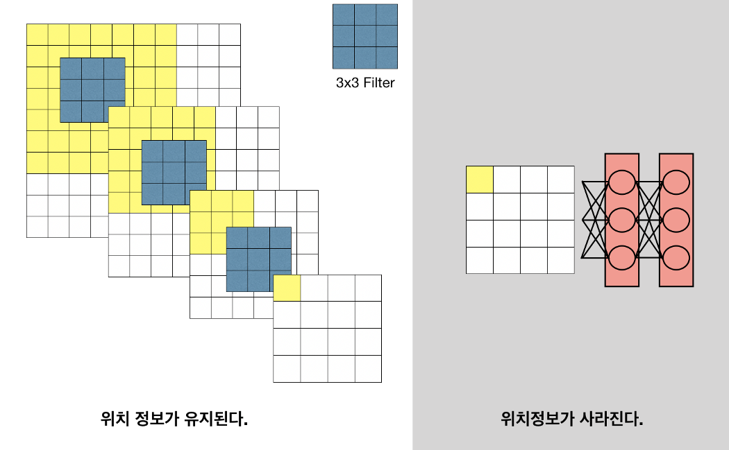 아래 그림(좌)를 보게 되면 fully-connected layer 연산 이후 Receptive field 개념이 사라진다. 그림(우)를 보게 되면 Dense layer에 가중치 개수가 고정되어 있기 때문에 바로 앞 레이어의 Feature Map의 크기도 고정되며, 연쇄적으로 각 레이어의 Feature Map 크기와 Input Image 크기 역시 고정된다.