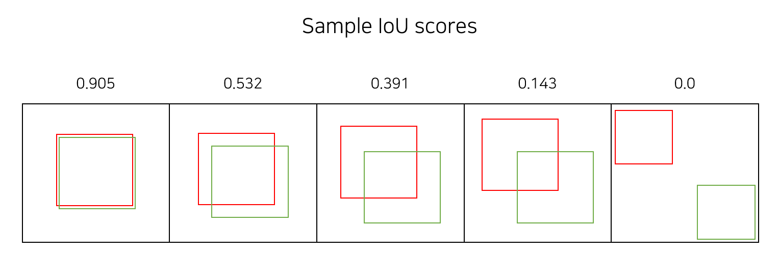 IoU는 아래의 그림[1] 같이 구해진다. 예측된 바운더리 박스와 사용자가 설정한 바운더리 박스 간 중첩되는 부분의 면적을 측정해서 중첩된 면적을 합집합의 면적으로 나눠준다.