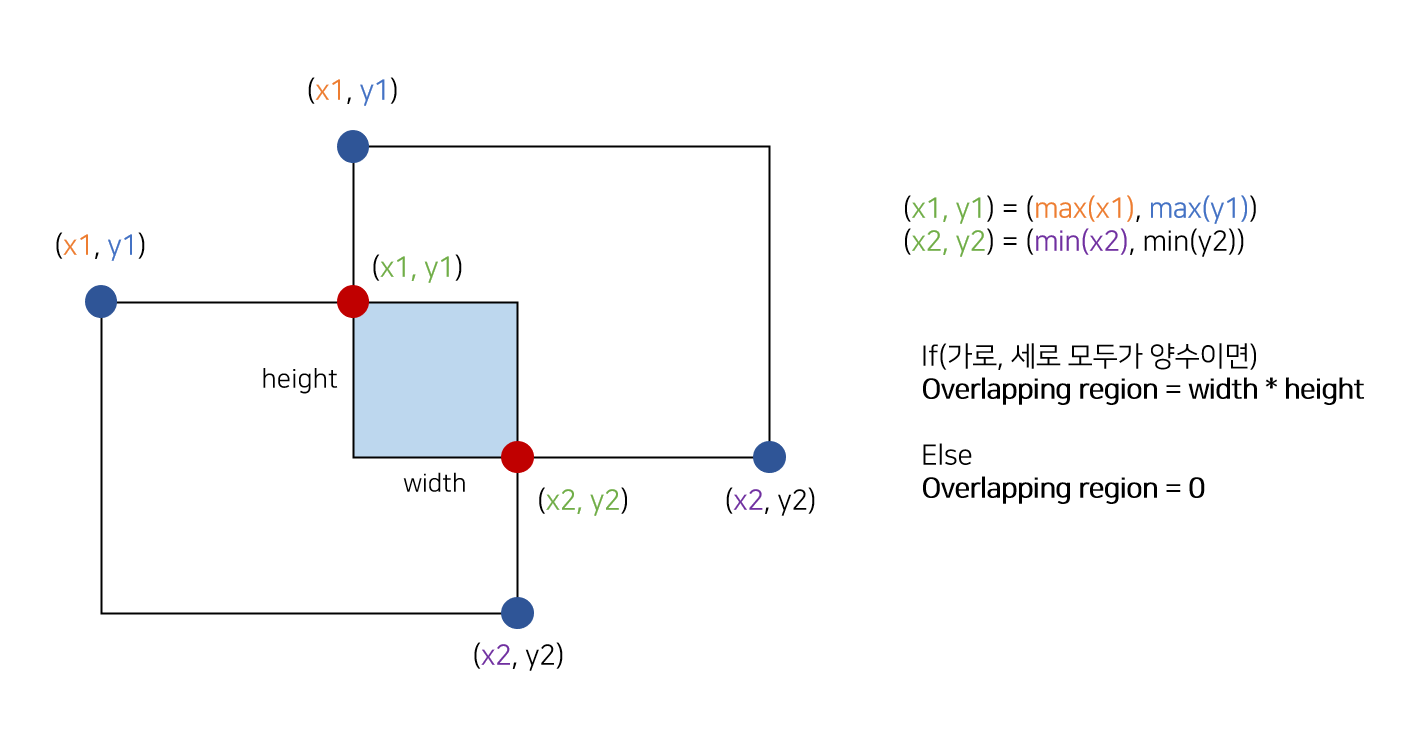 중첩 영역 계산은 박스 A, 박스 B의 왼쪽 상단, 오른쪽 하단의 좌표 값을 이용하여 중첩 부분의 왼쪽 상단, 오른쪽 하단의 값을 구한다. 그리고 width, height 값을 이용하여 Overlapping region 값을 구한다.