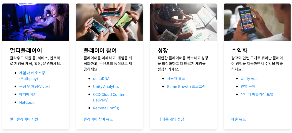 유니티는 자체적으로 다양한 기능들의 기술자료를 쉽고 편리하게 한 번에 Manual에서 확인할 수 있도록 해주며 서버 호스팅, 음성 및 채팅, Unity Ads, 인앱 구매 등 많은 기능들을 개발자에게 쉽고 빠르게 제공해준다.