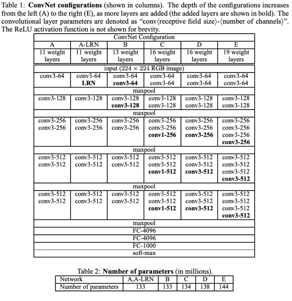 VGGNet 연구의 핵심은 네트워크의 깊이가 성능에 어떤 영향을 미치는지를 확인하고자 했다. VGGNet은 합성곱 레이어에서 3x3 필터를 사용하여 기존의 연구되었던 AlexNet(8layers)모델보다 2배 이상 깊은 네트워크 학습에 성공했으며, 오차율을 절반(16.4 > 7.3)으로 줄였다. VGG연구팀은 총 6개의 구조(A, A-LRN, B, C, D(VGG16), E(VGG19))를 만들어 성능을 비교했으며 깊이가 깊어질수록 분류 에러가 감소하는 것을 확인했다. 여기서 conv3는 3x3필터를, conv1은 1x1 필터를 의미한다. 또한 conv3-N에서 N은 필터의 개수에 해당한다. 예를 들어 conv3-64는 3x3필터를 학습 매개변수로 사용했다는 의미이다.