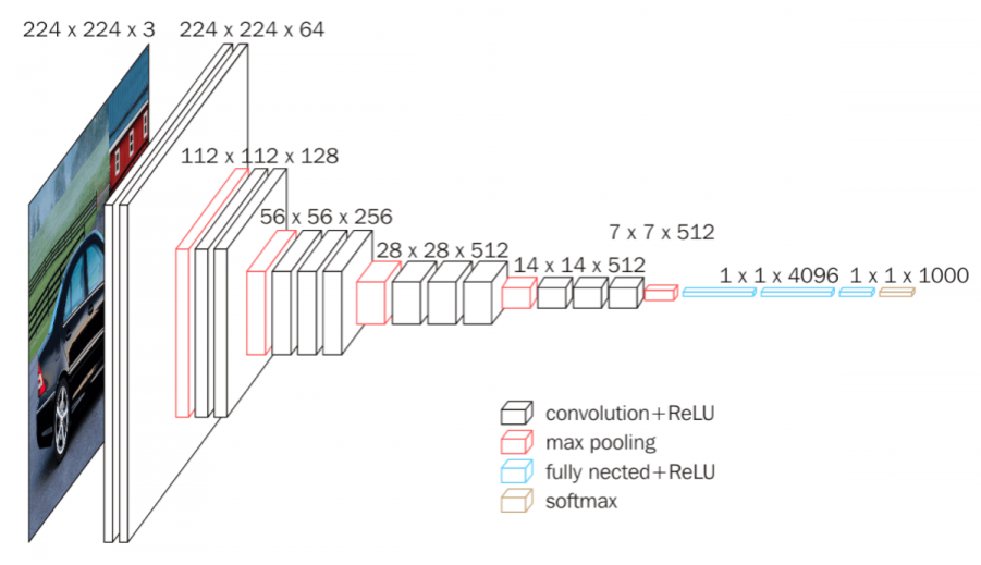 많은 CNN 분류 모델들 중 하나로 VGGNet은 옥스퍼드 대학에서 개발됐으며 2014년 ImageNet Challenge에서 정확도 92.7%를 달성하며 준우승 한 모델이다. VGGNet의 논문 이름은 Very Deep Convolutional Networks for Large-Scale Image Recognition 이다. VGGNet은 신경망 모델의 깊이(layer)에 따라 VGG16, VGG19로 불린다. 아래 그림을 보면 VGGNet을 시작으로 네트워크의 깊이가 확 싶어 지는 것을 확인할 수 있다. VGGNet은 사용하기 쉬운 구조와 좋은 성능 때문에 GoogleNet보다 많이 사용된다.