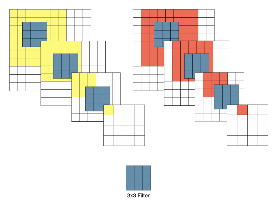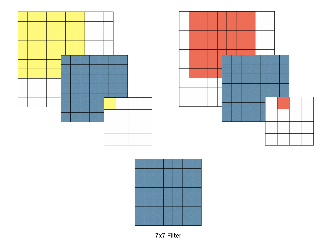 예를 들어 위 그림과 같이 10 x 10 이미지가 있다고 할 때 이 이미지에 대해 7 x 7 필터와 3 x 3필터로 각각 Convolution 수행하면 다음과 같은 특성이 있다.