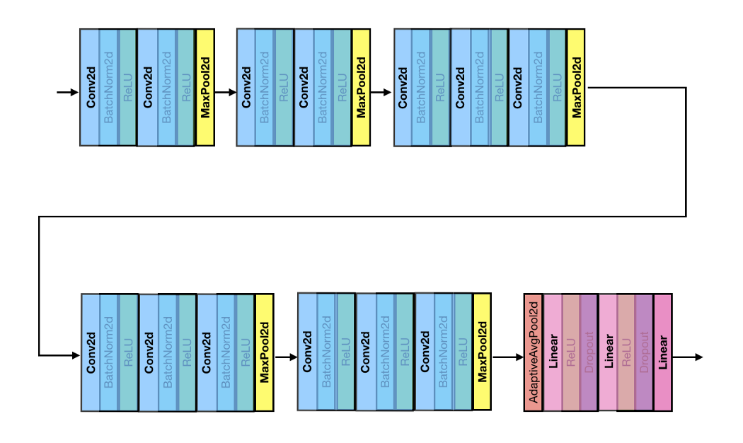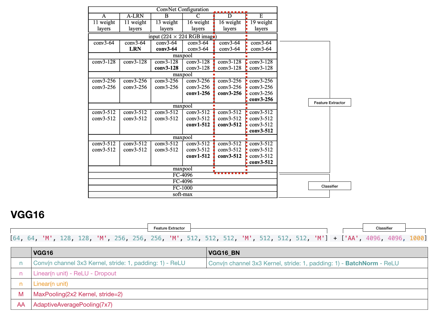 6개의 구조 중 D에 해당하는 VGG16을 예로 들면, 아래 사진과 같이 정리할 수 있다. Batch Normalization이 포함된 버전이 주로 활용된다.